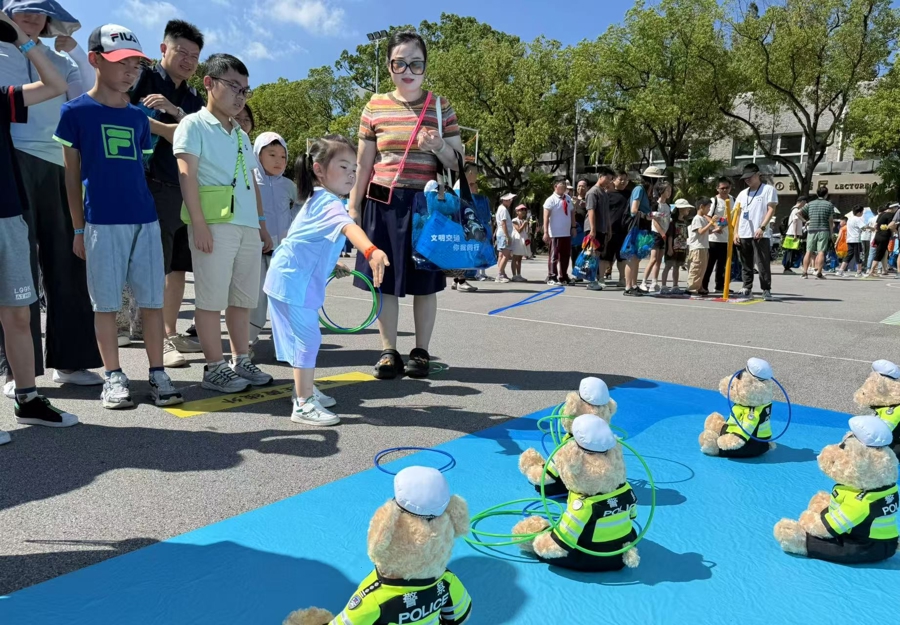 启动仪式后,百组家庭通过机器人互动的方式,学习文明出行安全知识,现场体验快乐大转盘(文明交通问答)、抓娃娃机(警熊)、交通标识猜谜、愤怒的小鸟、丢沙袋、捏泥人等文明交通趣味游戏。现场还安排激光射击体验、警械装备观摩、高科技警用设备展示等环节,如警用无人机、巡逻车、驾校AR、酒驾测试眼镜体验等。