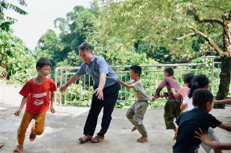 在爱店镇丈鸡教学点,蕉生定和学生们在一起玩游戏。新华社记者 崔博文 摄