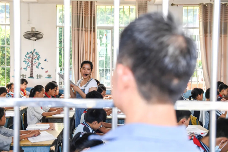 在爱店镇中心小学,蕉生定站在教室外看女儿上课。新华社记者 曹祎铭 摄