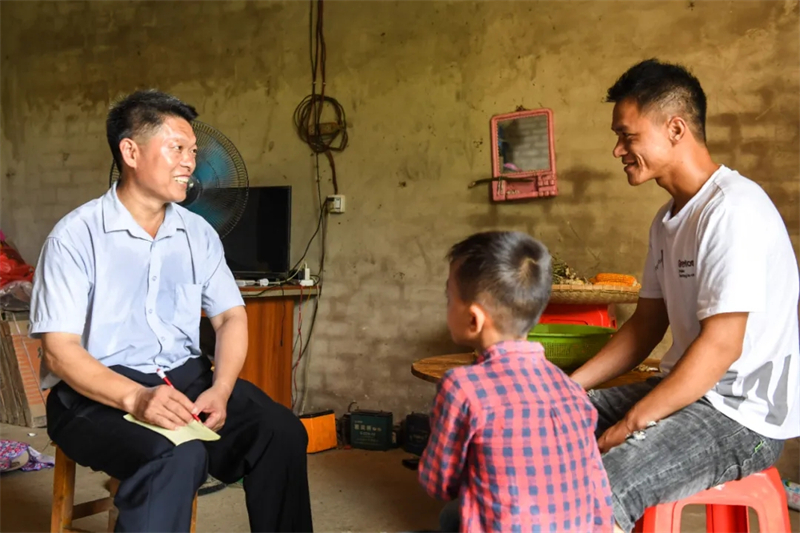 蕉生定(左)利用放学后的时间进行家访。新华社记者 曹祎铭 摄