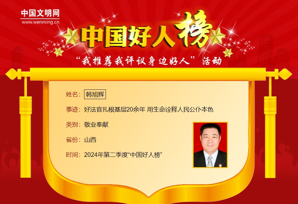 法袍在身、天平在心。韩旭辉在司法一线奋斗33年,真心实意为群众办实事、解难事、理心事,以“如我在诉”意识办好一件件民生小案、做实一件件民生实事,被群众称为“太行山上的好法官”。最高人民法院、人力资源社会保障部追授韩旭辉同志“全国模范法官”称号,中共山西省委追授他“山西省优秀共产党员”称号。