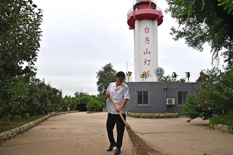 墩台山山顶,台子山灯塔巍然耸立,为进出鲅鱼圈港区的船舶提供助航服务。塔下,交通运输部北海航海保障中心营口航标处灯塔工王洪安已在此坚守21年,守护灯塔长明,为千万航船指引方向。