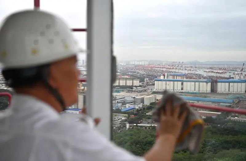 王洪安在擦拭台子山灯塔顶部灯器室玻璃上的灰尘,远处是营口港。新华社记者 周华 摄