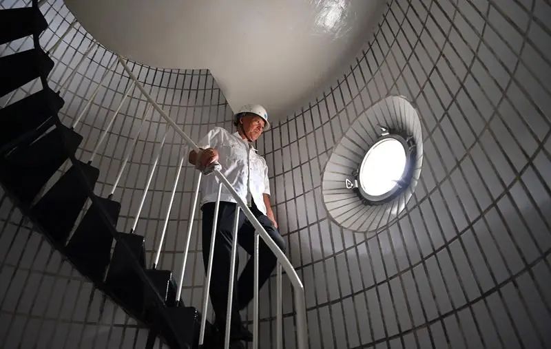 王洪安在灯塔顶部检查灯器工作状态后,从七层楼高的旋转楼梯走下。新华社记者 周华 摄