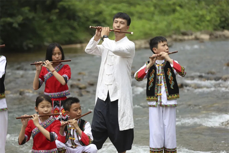 肖惠文(右二)带着竹笛班的孩子们在溪边吹奏。新华社记者 彭昭之 摄