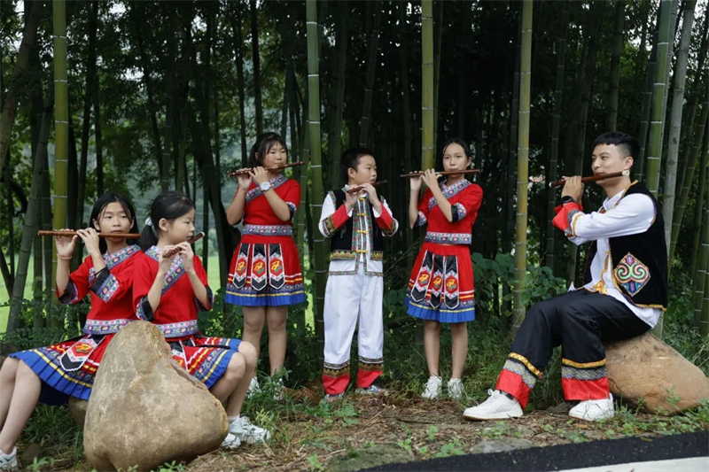 肖惠文(右一)带着竹笛班的孩子们在竹林里吹奏。新华社记者 彭昭之 摄