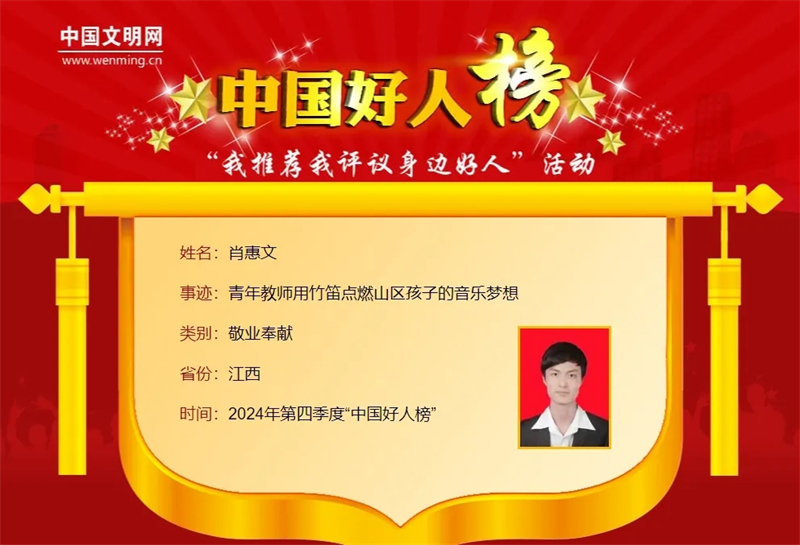 江西省吉安市泰和县大山深处,90后小伙肖惠文在水槎乡中心小学担任音乐教师。这些年来,他一直在探索如何为村里的孩子们上好音乐课,用竹笛传递音乐的美妙和魅力。