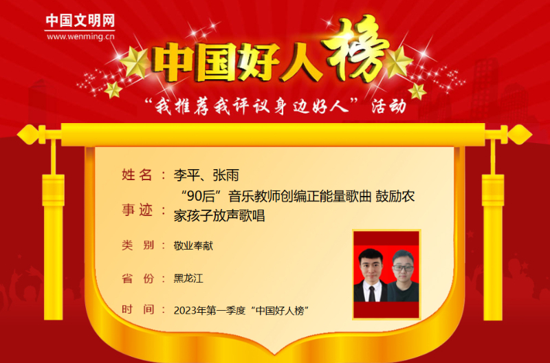 李平、张雨两位“90后”音乐教师多年来倾情付出,成立“村里的孩儿”音乐班,创编正能量歌曲,用音乐陪伴孩子快乐成长。他们把绚丽的青春时光毫无保留地献给了自己所钟爱的农村教育事业。