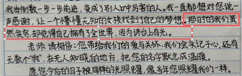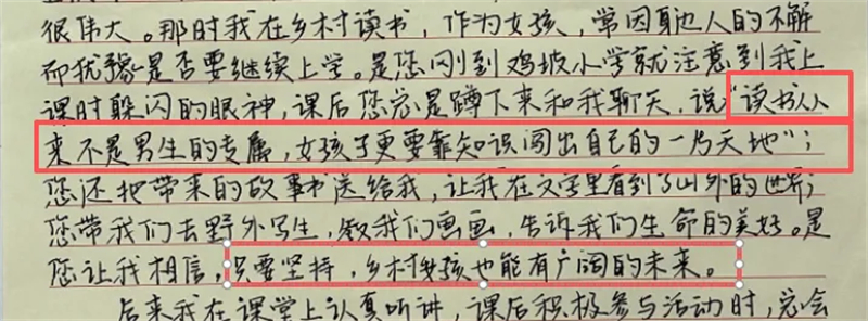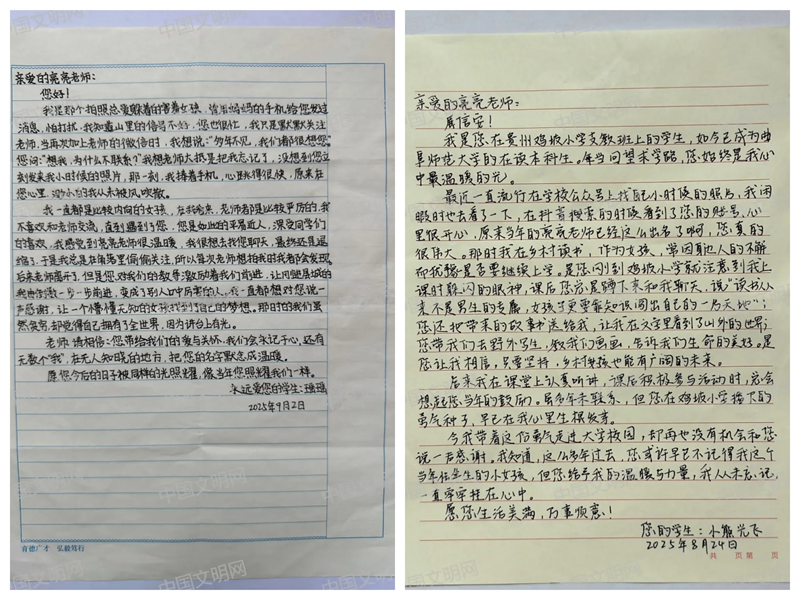 两个学生写给侯长亮老师的亲笔信。受访者供图