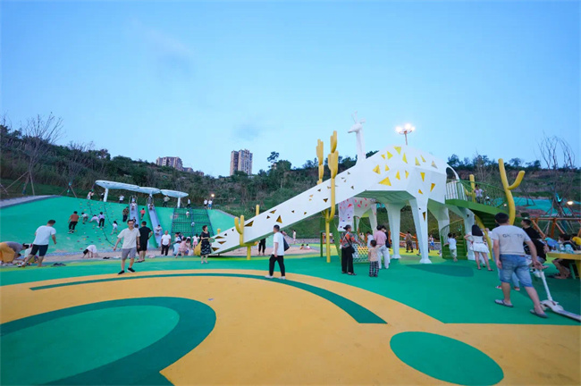 在四川省广安市西溪河畔西溪峡公园两侧的儿童乐园里,欢声笑语此起彼伏,孩子们坐滑梯、堆沙塔,尽情享受着惬意时光。