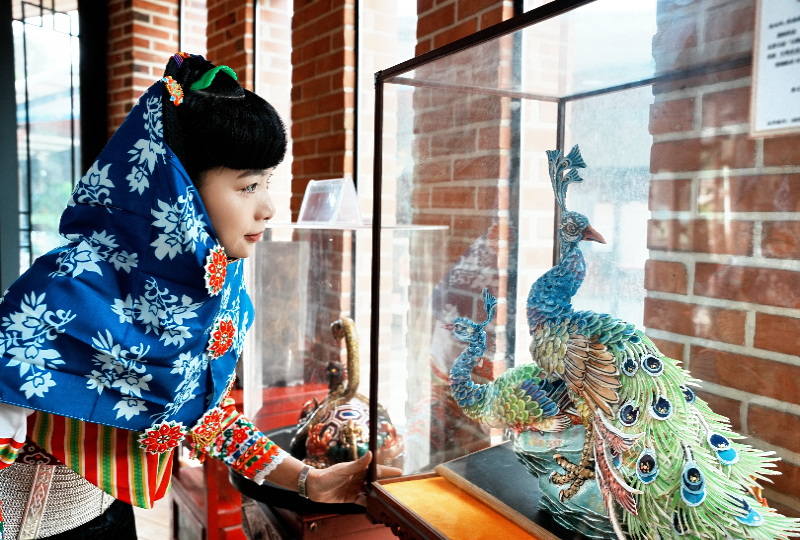 金线穿梭,流光溢彩。泉州金苍绣技艺省级代表性传承人林秀清凭借其精湛技艺,于指尖处发力,让这项被誉为“立体刺绣”的古老技艺,在当代焕发出新生机。她自创“灌棉技术”提高绣艺效率,在传统戏曲绣袍服饰上延续着华丽基因。她与本土设计师一起,将金苍绣的祥云龙凤图腾绣上时尚手袋、高跟鞋甚至融入现代礼服,让金苍绣技艺走上走秀舞台。泉州非遗馆里,林秀清亲手展示金苍绣体验现场,吸引不少游客驻足观看参与。